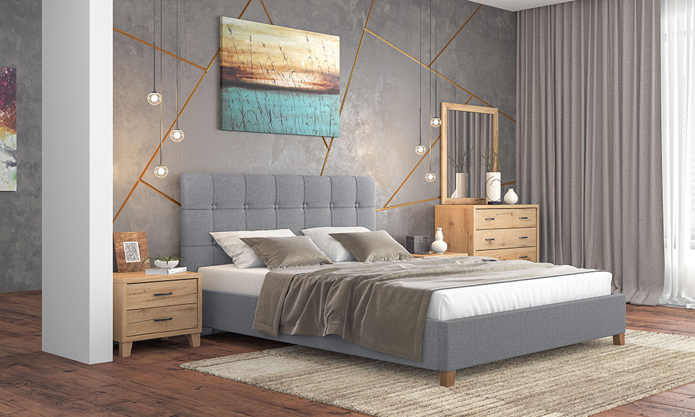 Bed N64 Light Grey Fabric & Honey Furniture