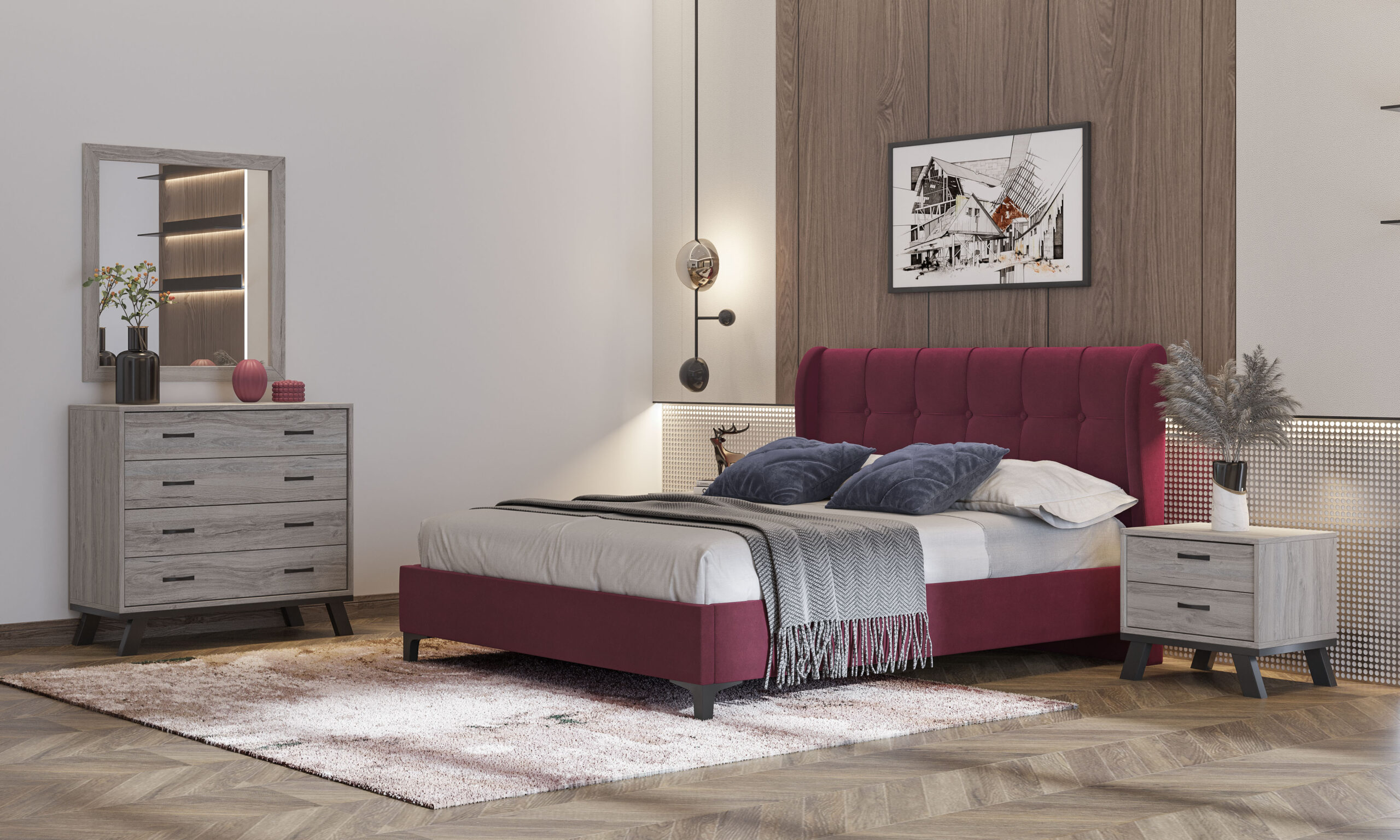 Bed N84 Burgundy Fabric & Ash Grey Furniture